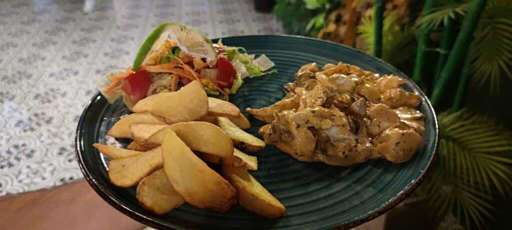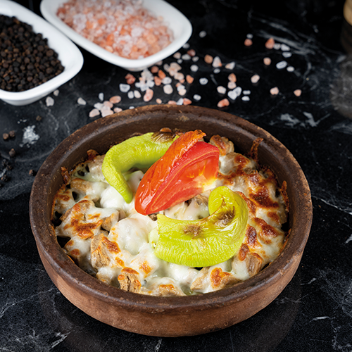 Mexician Chicken İçindekiler:tavuk,mantar,acı sos, krema- yanına elma dilim poatates,salata Fiyat:360